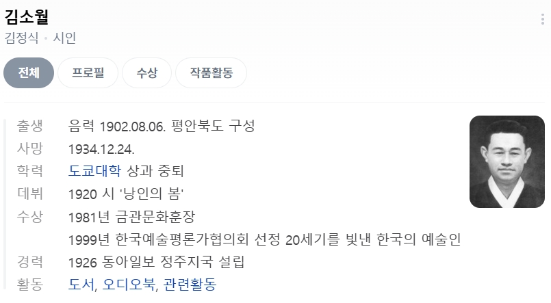 김소월은 배재고등학교를 졸업한 후, 일본으로 유학을 갔어요. 그곳에서 그는 문학에 대한 깊은 관심을 가지게 되었고, 다양한 문학적 영향을 받았습니다. 그의 시는 1920년대부터 발표되기 시작했으며, 그 당시 한국의 사회적 상황과 개인적인 감정을 잘 반영하고 있어요. 김소월은 1934년 10월 24일, 32세의 나이에 세상을 떠났지만, 그의 작품은 여전히 많은 사람들에게 읽히고 있습니다.